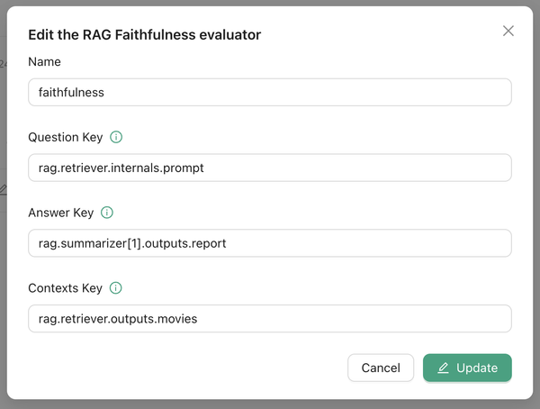 From the trace we saw before, we could say that answer maps to the second rag summarizer output report, denoted by rag.summarizer[1].outputs.report. Similarly, the contexts map to the rag retriever output movies, denoted by rag.retriever.outputs.movies.