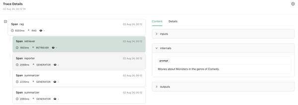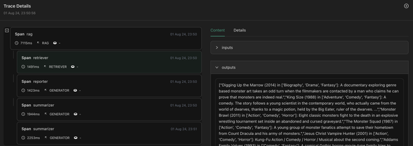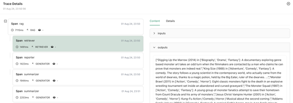 Upon clicking on view trace, you should be able to see the inputs and outputs for each instrumented stage in the RAG workflow.