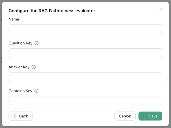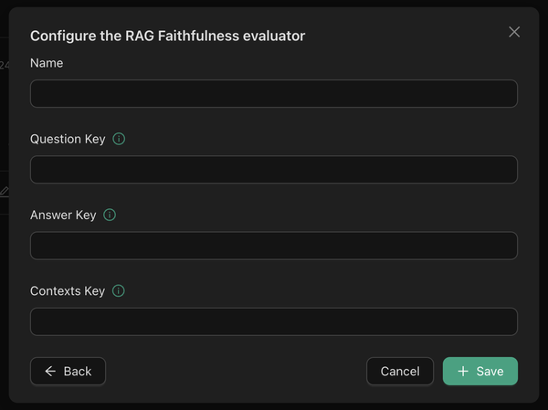 RAG evaluators, based on RAGAS are different from other evaluators in Agenta in that they often require internal variables. For instance, Faithfulness and Context Relevancy both require question, answer, and contexts.