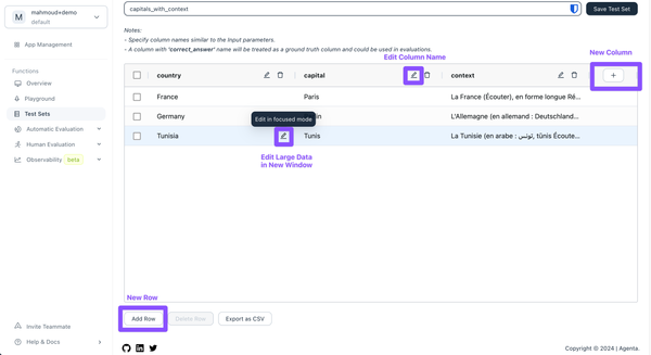 The Agenta UI provides an intuitive interface for creating and editing test sets manually. This is ideal when you want to quickly create or edit small test sets.